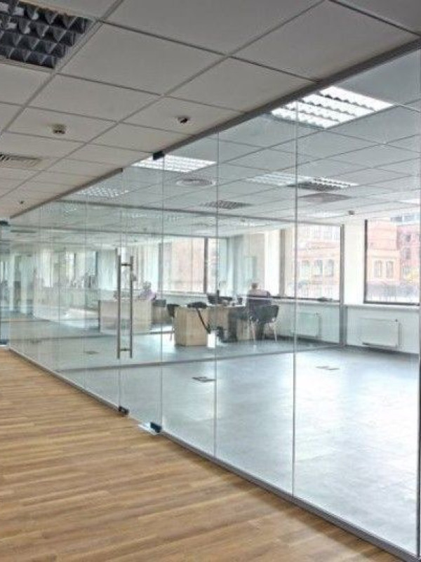 Возможности конструкций цельностеклянных перегородок не ограничены. С их помощью можно создать помещение внутри помещения любой конфигурации от классической прямоугольной до необычной округлой или вытянутой.